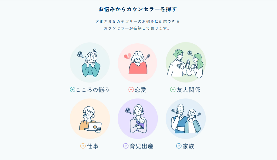 • 悩みの種類(育児・家族・仕事・恋愛)ごとに相談可能