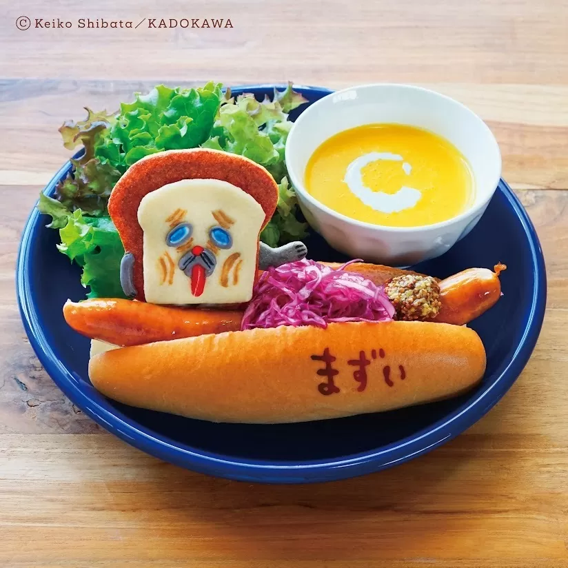ホットドッグには「まずい」の文字が刻まれており、パンどろぼうの独特な表情のクッキーが添えられます。