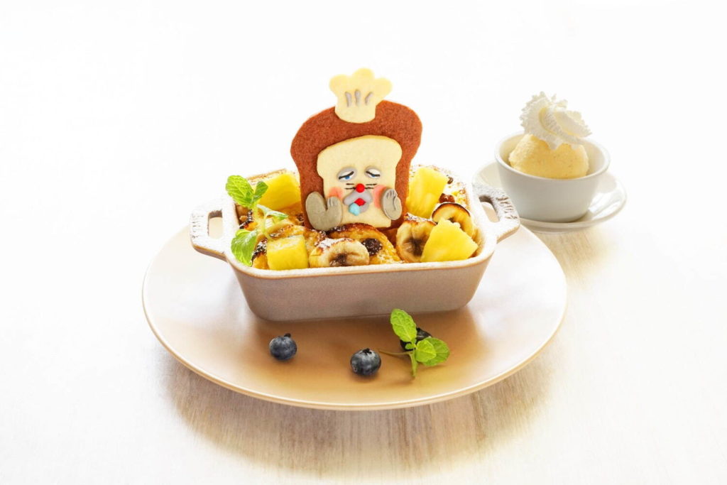 こんがり焼いたパンプディングに、パンを抱きしめる穏やかなパンどろぼうクッキーとカラフルなフルーツが添えられています。