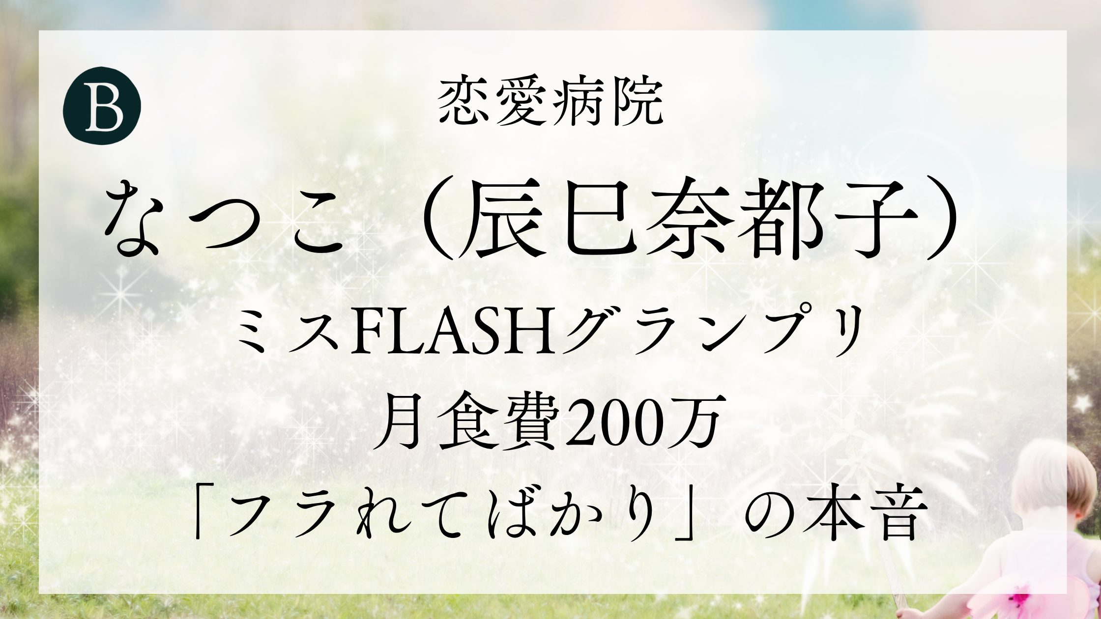 - 辰巳奈都子(38歳)はABEMA『恋愛病院』に「なつこ」として参加。ミスFLASH2007グランプリ・元グラビアアイドル・実業家の女性キャスト最年長。