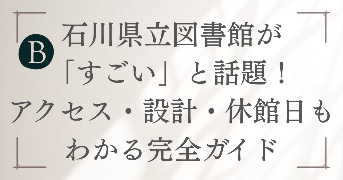 まなぶ 【完全保存版】石川県立図書館のアクセス・駐車場ガイド|バス・徒歩・自転車まで徹底解説! 【完全保存版】石川県立図書館のアクセス・駐車場ガイド|バス・徒歩・自転車まで徹底解説! 2025.06.23 まなぶ